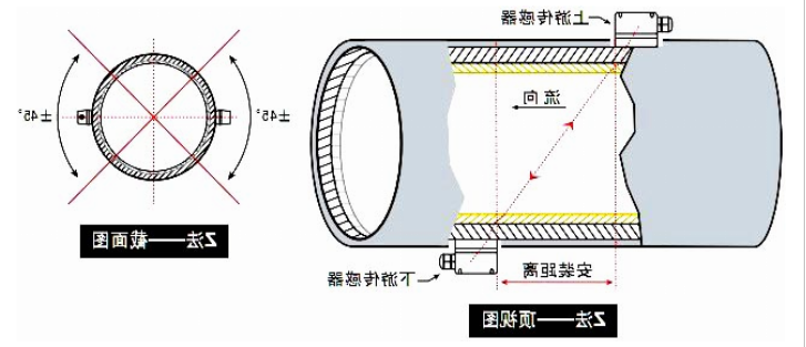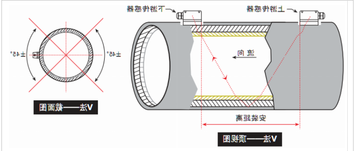 一般情况下,V法是比较标准的安装方法,使用方便、测量准确,安装时两传感器水平对齐,其中心线与管道轴线水平即可,可测管径范围约DN15mm-DN400mm。