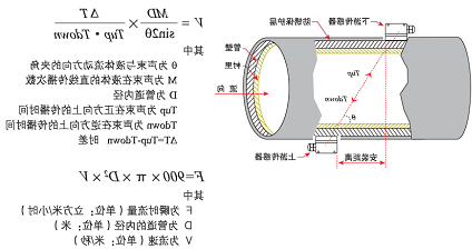 当超声波束在液体中传播时,液体的流动将使传播时间产生微小变化,其传播时间的变化正比于液体的流速,零流量时,两个传感器发射和接收声波所需的时间完全相同(唯一可实际测量零流量的技术),液体流动时,逆流方向的声波传输时间大于顺流方向的声波传输时间。其关系符合下面表达式: