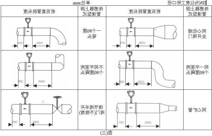1. 涡街流量仪表对安装点的上下游直管段有一定要求,否则会影响介质在管道中的流场,影响仪表的测量精度。仪表的上下游直管段长度要求见图(三)