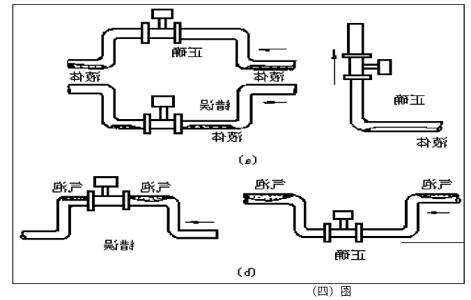 5. 测量气体时,在垂直管道安装仪表,气体流向不限。但若管道内含少量液体,为了防止液体进入仪表测量管,气流应自下而上流动,如图(四)a所示